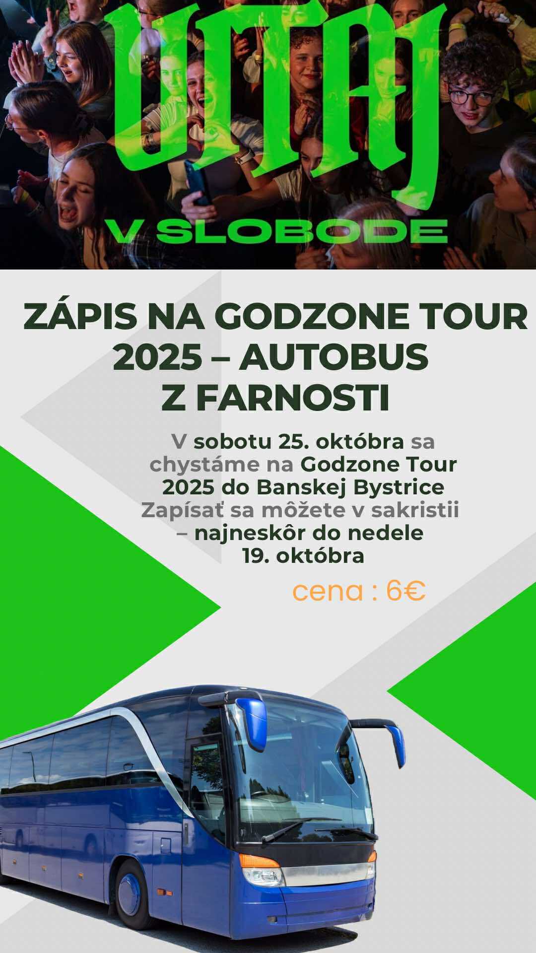 Pozývame na Godzone tour 2025. Autobus z našej farnosti pôjde v sobotu 25. októbra do Banskej Bystrice. Zapísať sa môžete v sakristii - najneskôr do nedele 19 októbra. Odchod autobusu na Godzone tour 2025 bude v sobotu 25.10.o 16:00 z Chrenovca. Cena za autobus 6 euro.