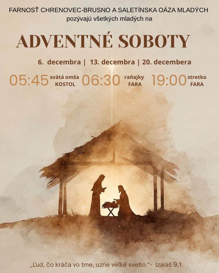 Spoločenstvo mladých SOM Chrenovec srdečne pozýva a to nielen mladých na adventné soboty. Program o 5:45 sv. omša, 6:30 Raňajky fara, 19:00 stretnutie spoločenstva na fare. Prvá adventná sobota bude už budúcu sobotu, 6. 12. 2025 na deň spomienky svätého Mikuláša