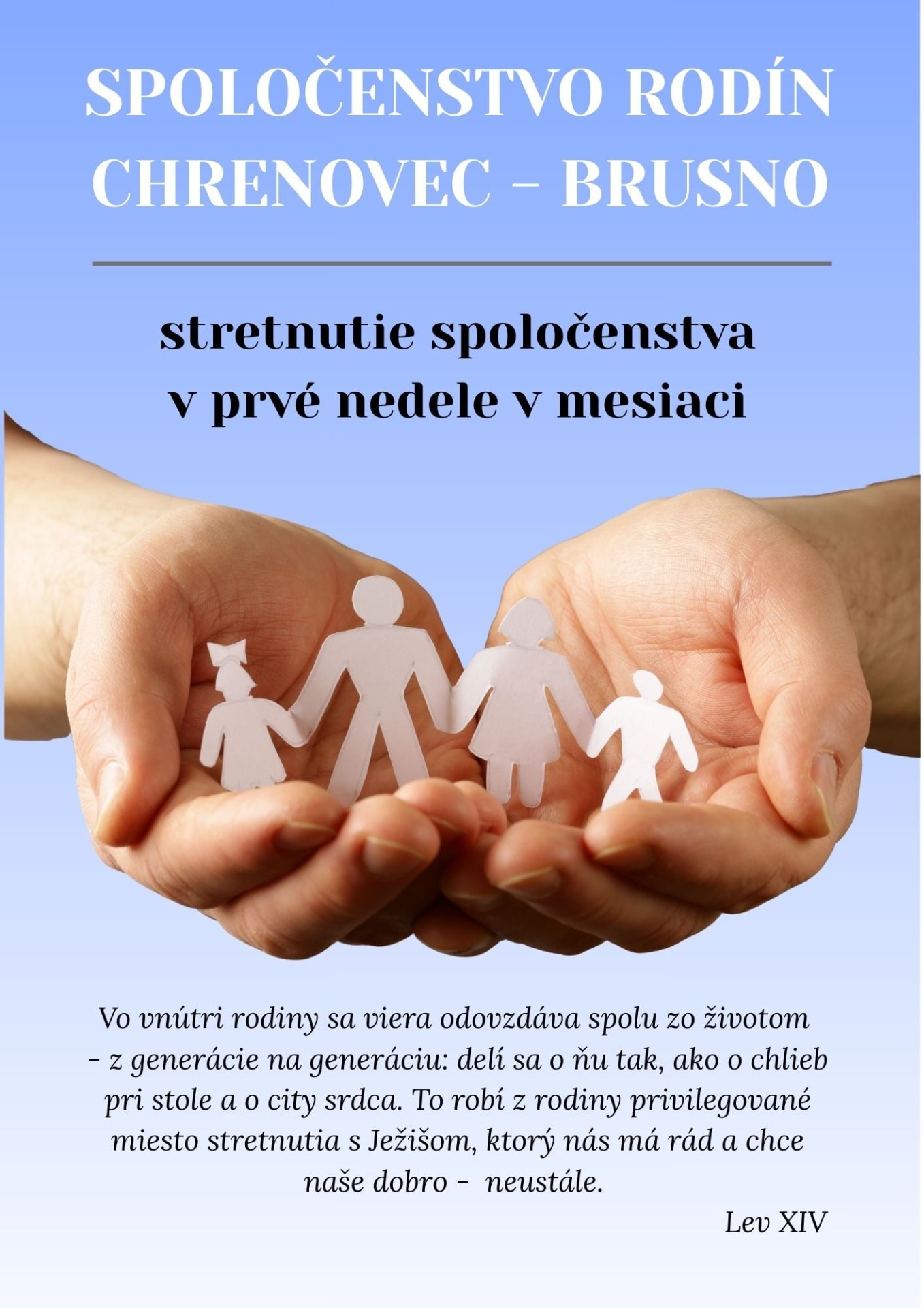 Vo vnútri rodiny sa viera odovzdáva spolu so životom – z generácie na generáciu: delí sa o ňu tak ako o chlieb pri stole a o city srdca. To robí z rodiny privilegované miesto stretnutia s Ježišom, ktorý nás má rád a chce naše dobro – neustále. (Lev XIV)